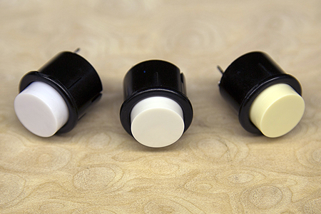 The thumb piston is pressed to create a momentary contact by closing a reed switch with a magnet in the button.